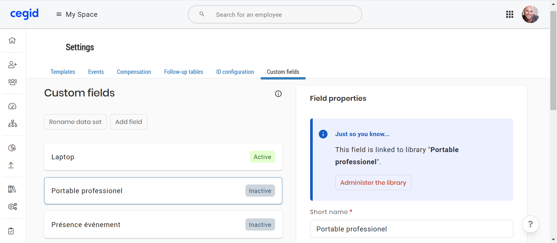 From an employee file, at the level of the data set Custom fields, click on the icon